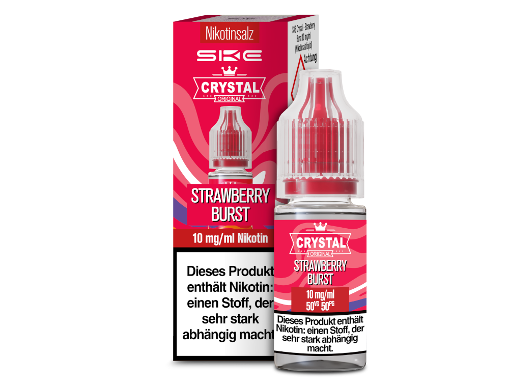 Pro 10 ml Flasche erhalten Sie Niktoinsalz Liquid der Marke SKE. Die Sorte Crystal Strawberry Burst entfaltet beim Verdampfen mit einer E-Zigarette den Geschmack von Erdbeeren. Die Stärke der SKE Nikotinsalz Liquids beträgt 10 mg/ml und 20 mg/ml.Auszeichnung gemäß CLP-Verordnung (EG) Nr. 1272/2008